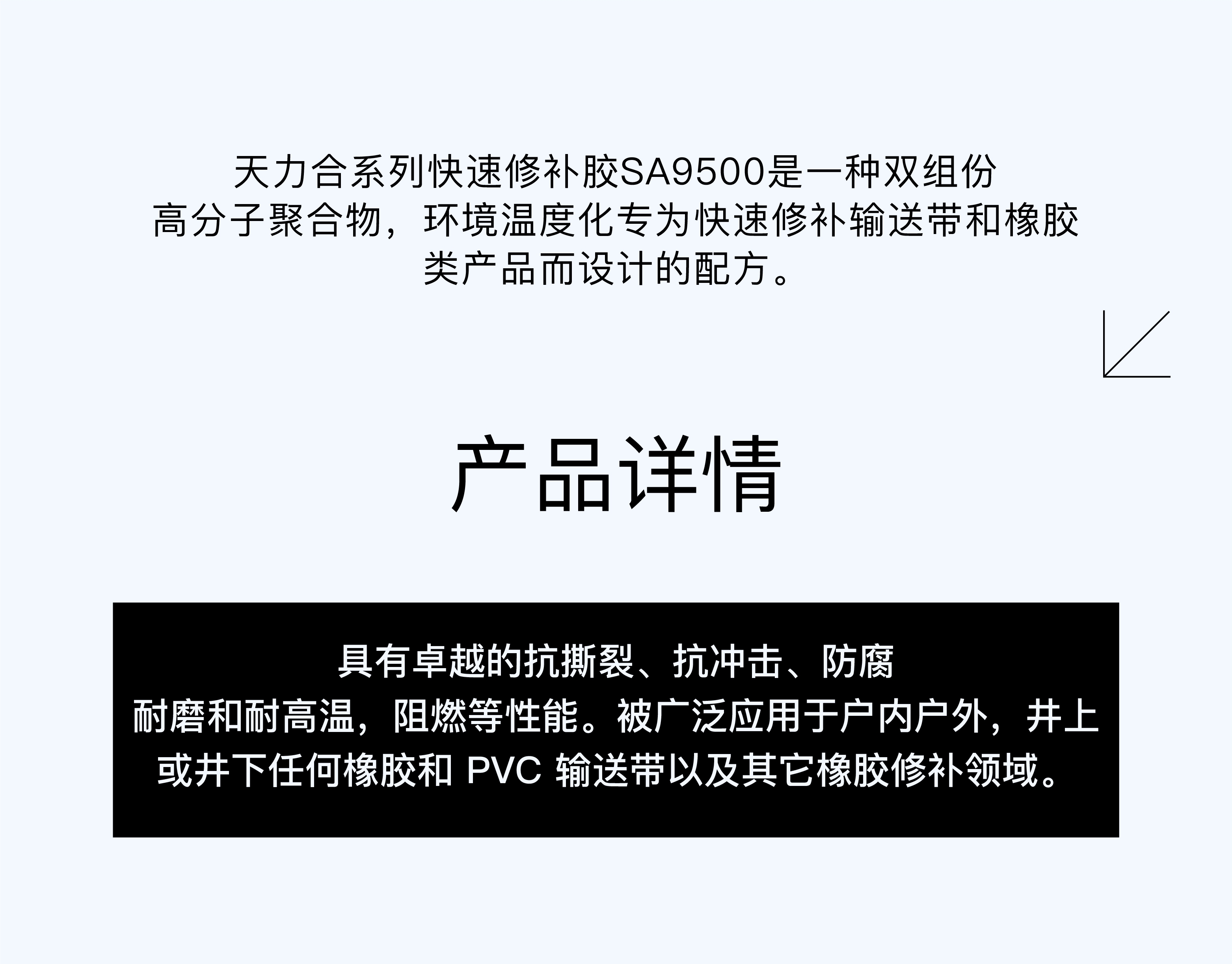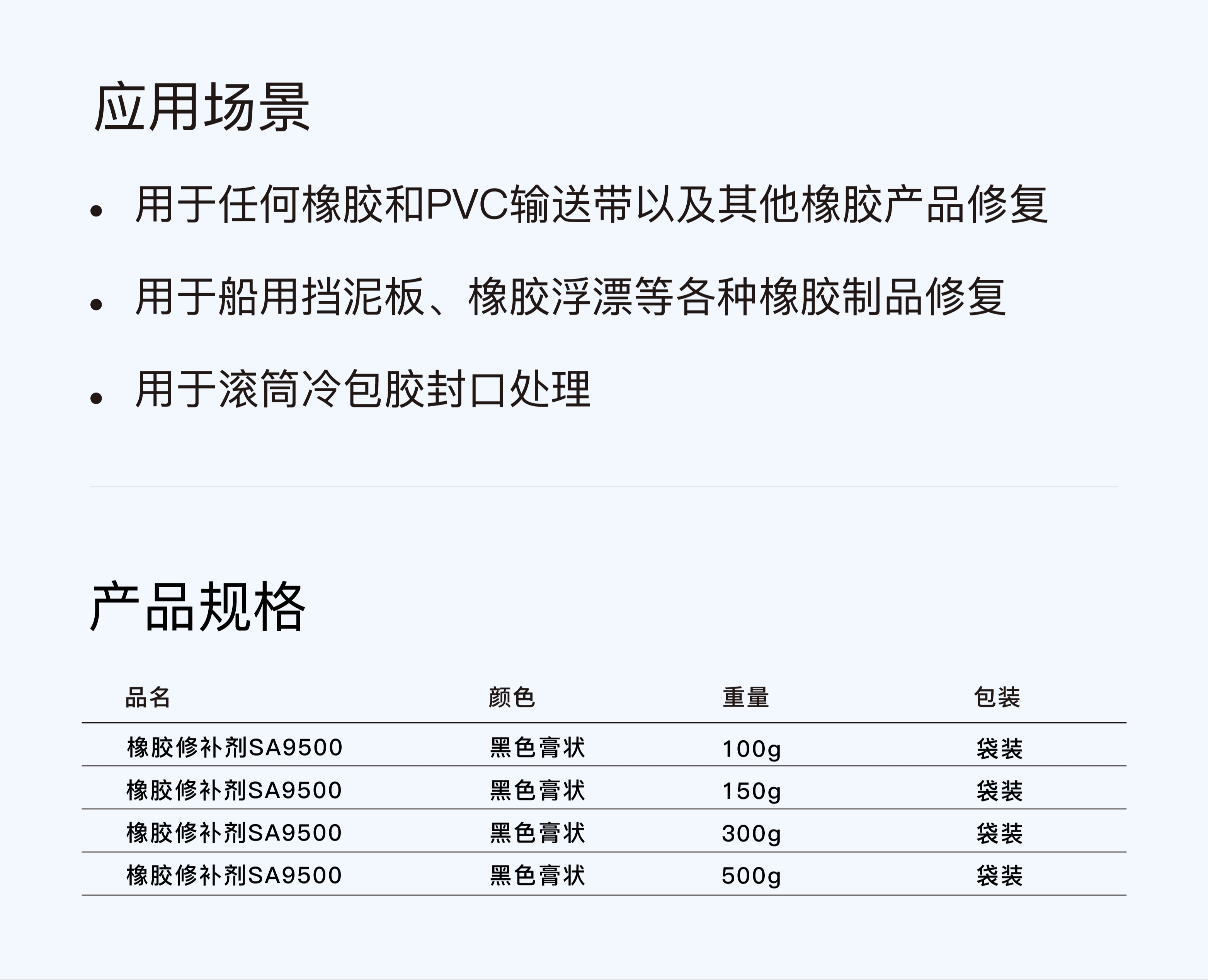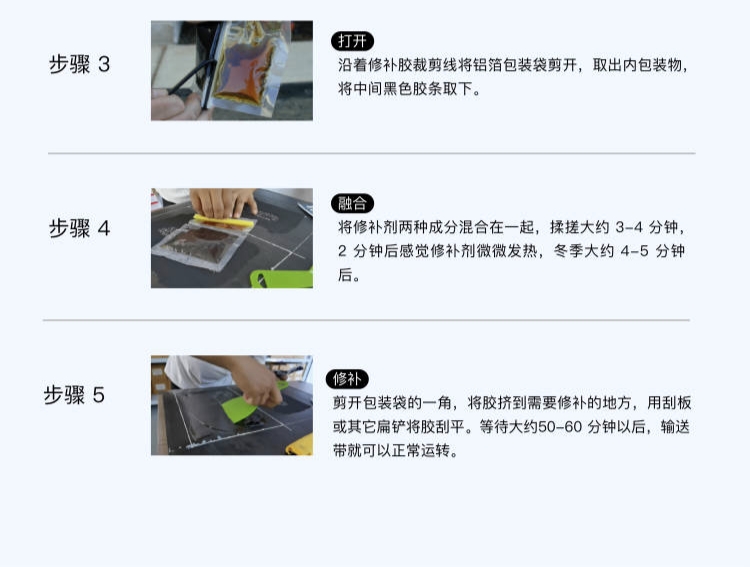 用途范围 | 橡胶输送带修补、滚筒冷包胶填缝处理 | ||