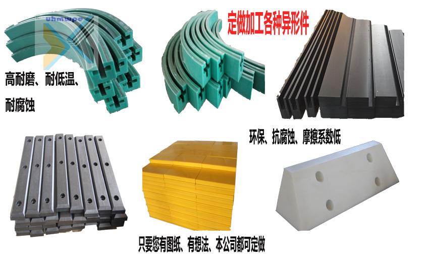 我们生产的超高分子量聚乙烯异形件包括:滑块、刮板、导轨、吸水箱面板、轴承、滚轮、星形轮、轴套、刮刀、密封圈、船舶零部件和其他机械设备零件,尤其适合于各类机械、纺织等设备作配件用,其超强的耐磨性和超长的使用寿命,为不同行业客户提供各种加工定制服务。