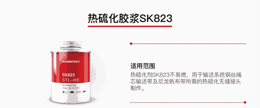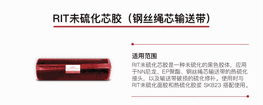 可用于NN尼龙、EP聚酯、普通帆布、ST钢丝绳芯输送带热硫化接头和接缝处,硫化之后具有优秀的耐磨耐腐蚀特点,使用时需要与 RIT 未硫化中垫胶以及热硫化胶浆 SK823 配搭。