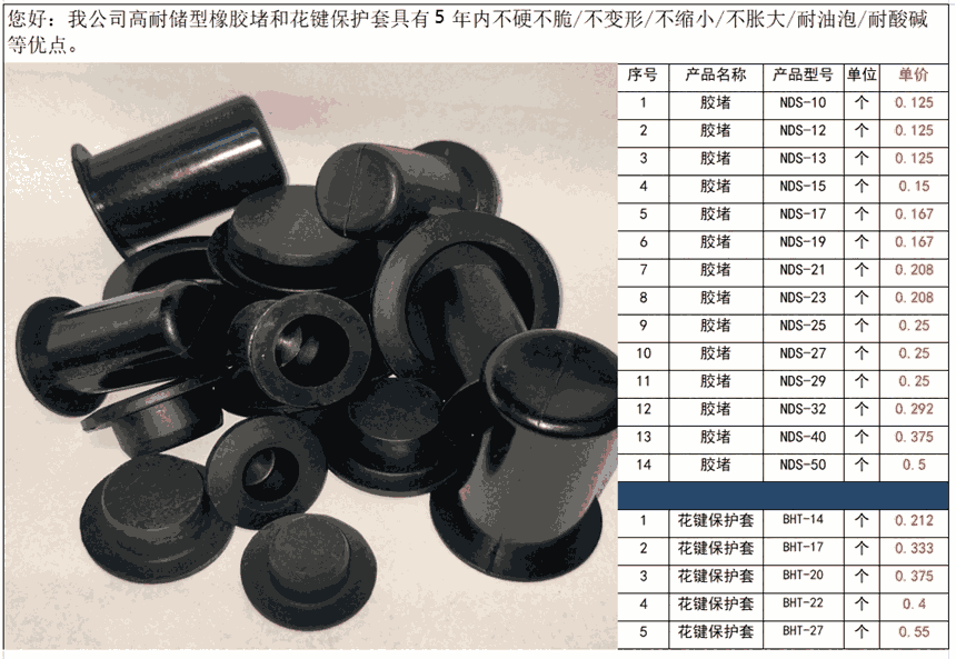 我公司高耐储型花键保护套原材料采用特殊配方,具有耐储、耐老化、耐油、耐紫外线、耐臭氧等优点,可以保证5年内不硬不脆、不缩小、不胀大,可根据客户需求定制,