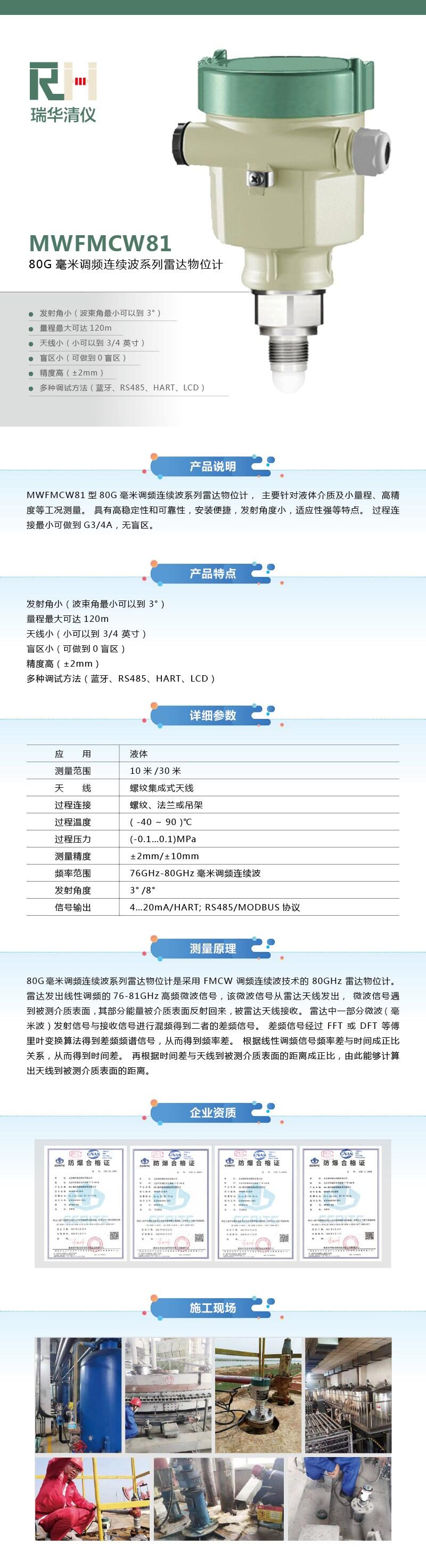 产品说明:MWFMCW81型80G毫米调频连续波系列雷达物位计, 主要针对液体介质及小量程、高精度等工况测量。 具有高稳定性和可靠性,安装便捷,发射角度小,适应性强等特点。 过程连接最小可做到G3/4A,无盲区。