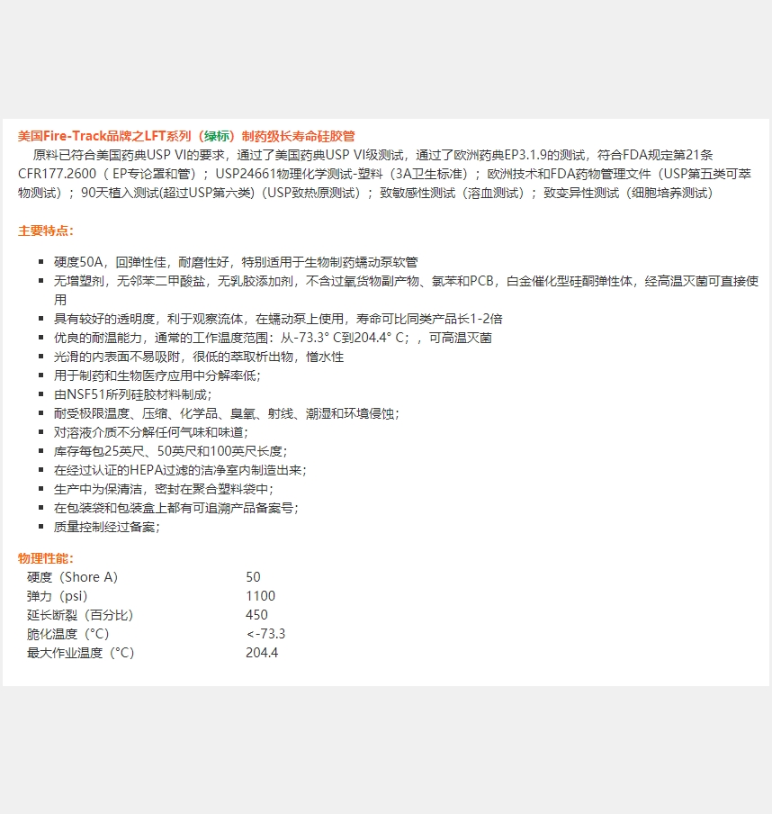 菲尔铁克FireTrack LFT系列 长寿命硅胶管16#:铂金硫化,高耐久度,包装400小时的长寿命;特别适用于不间断长时间液体输送生产线。FDA、USP、3A认证。