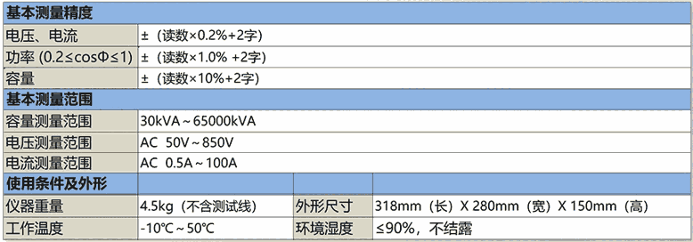 仪器可对10kV配电变压器的能效等级进行准确的测量与判断,并且对应能效等级,油浸式变压器损耗可测量到S22(电工钢带)和SH25(非晶合金);干式变压器损耗可测量到SCB18(电工钢带)和SCBH19(非晶合金)。
