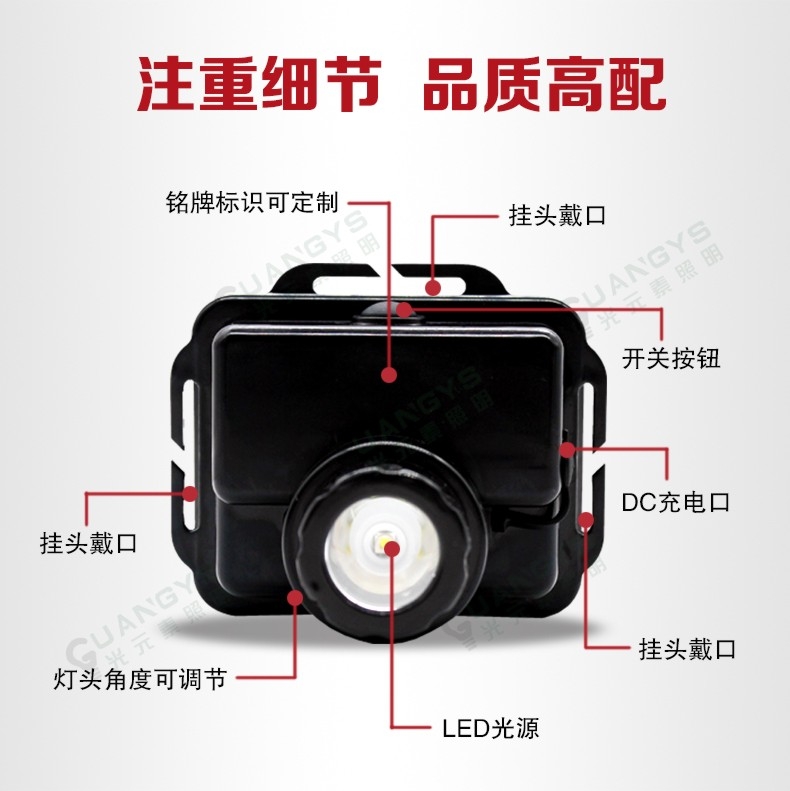7:使用方便:人性化设计,可直接头戴或安装在头Kui上使用,头带柔软、弹性好,长短可调,照明角度可随意调节;