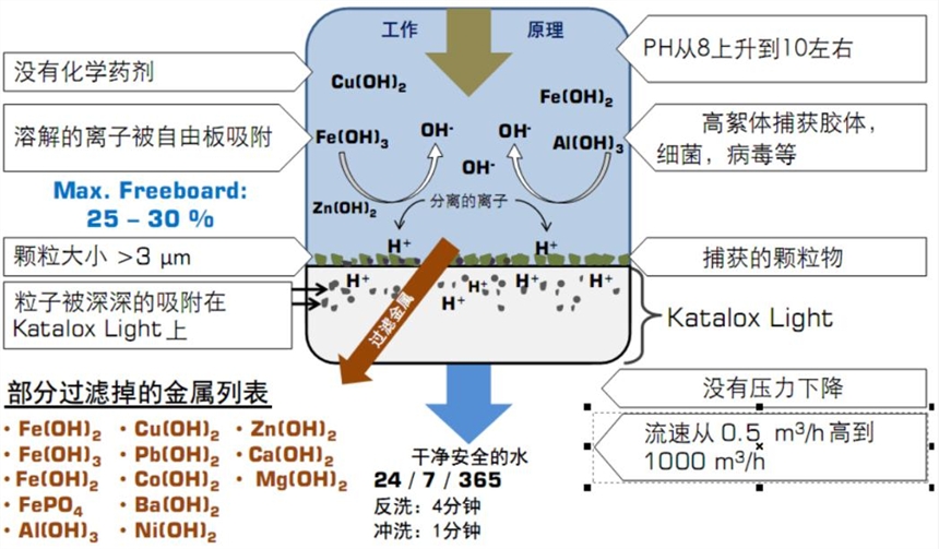 KATALOX-LIGHT滤料可以有效去除铁锰,还可有效的降低锌、铜、铝、铅、钴等重金属,对于放射性核素以及硫化氢、CN也具有很强的去除能力。