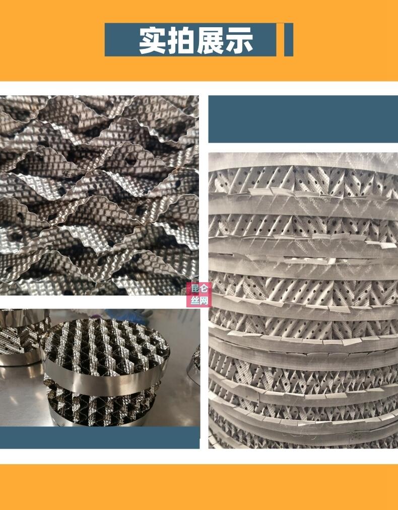 孔板波纹填料是在金属薄板表面冲孔、轧制小纹、最后组装而成的规整填料,具有阻力小、气液分布均匀、效益高、通量大、放大效应不明显等特点,应用于负压、常压和加压操作。