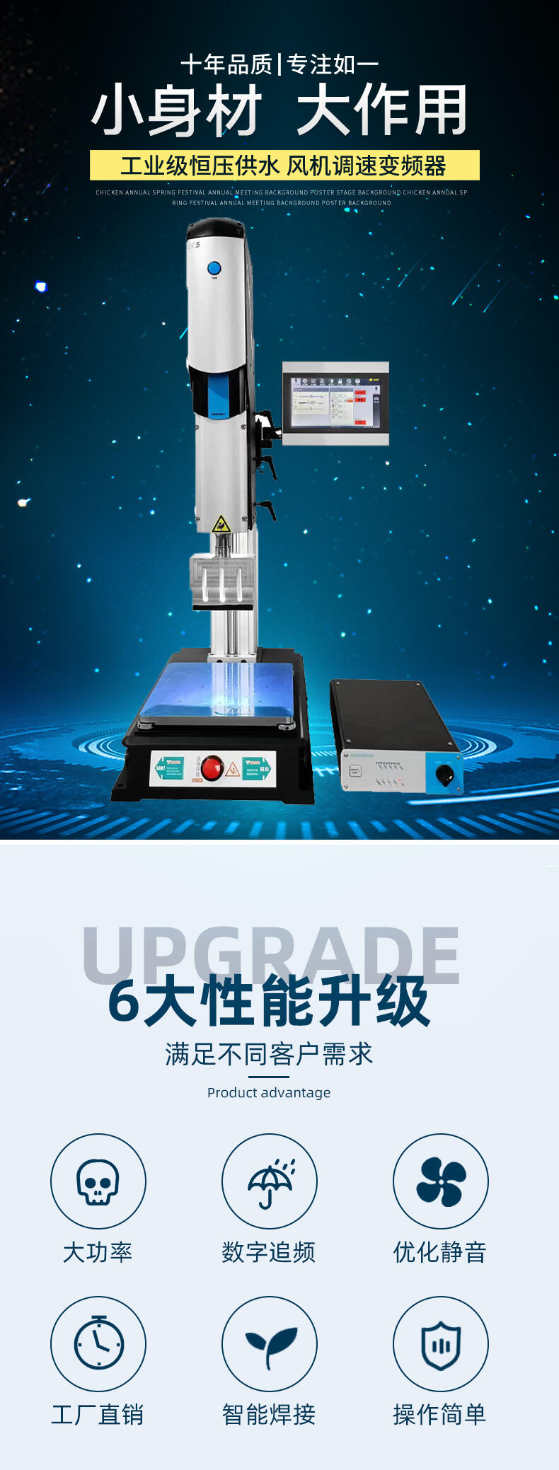东莞浩焊超声科技有限公司专业生产销售15khz 2600w超声波焊接机,热铆机,旋熔机,超声波模具,深圳超声波加工,超声波压花,塑胶热熔机,东莞超声波熔接机。浩焊超声波科技是一家专业从事塑胶焊接设备技术开发、生产、销售、服务为一体的综合性企业。公司全体同仁秉承团结务实、努力拼搏、不断创新的精神,在超声波、高周波、电热式、旋转式塑胶焊接及非标制作焊接技术领域博采中外技术之精华,以“树诚信经营”为服务宗旨,不断追求更高的目标,挑战自我、超越自我,致力成为业界精英。 我们将一如既往以高性价比的产品、合理的价格、及时周到的售后服务热情忠实的与您合作、为您服务。欢迎您与我们共同研讨,共同发展。
