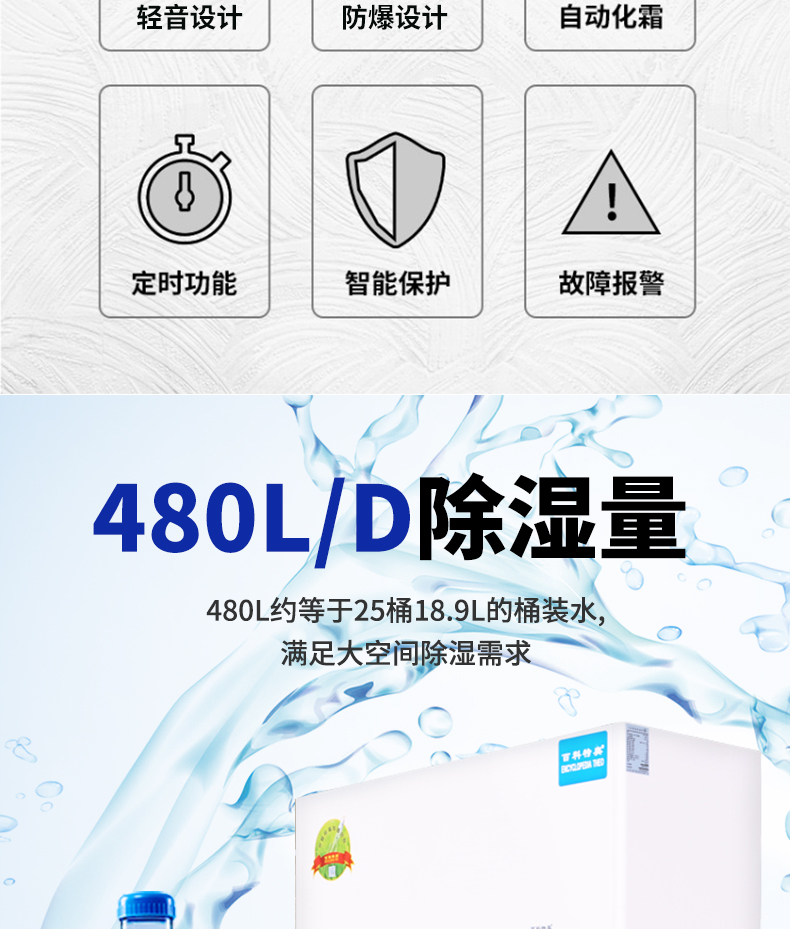 除湿量 | 480升/天 20公斤/小时(30℃-RH80%) | ||