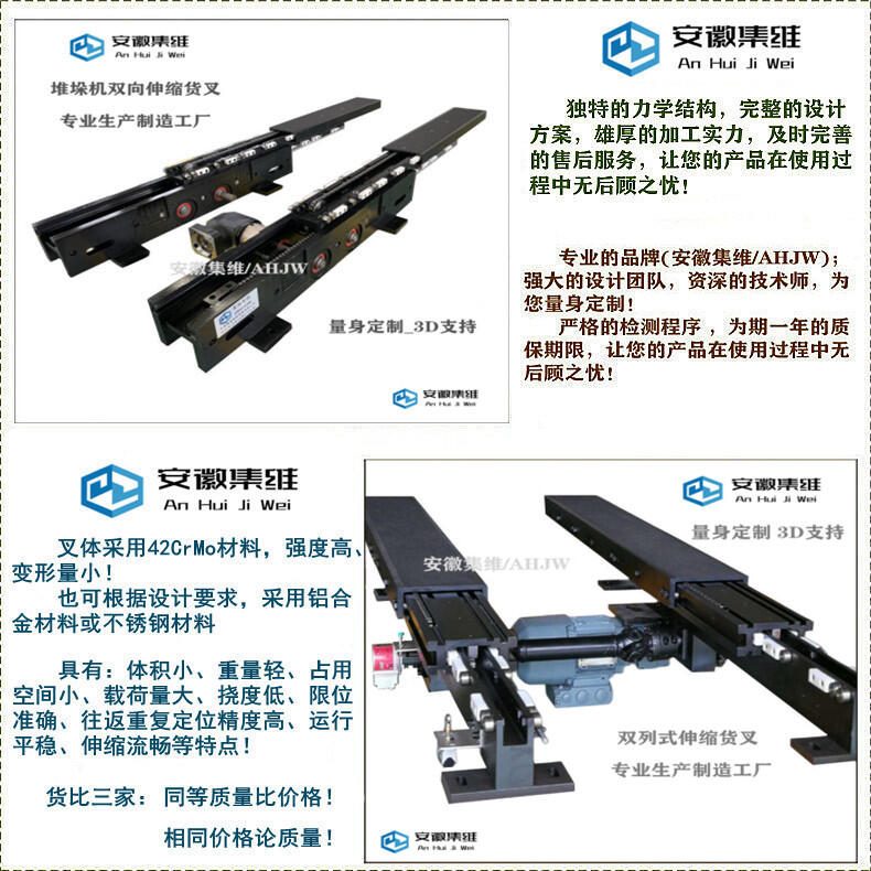 安徽集维智能装备有限公司[马鞍山市]是一家集研发、生产、销售为一体的伸缩货叉生产制造厂家,拥有完整的质量管理体系、多位资历深厚的工程设计师和经验丰富的技术团队,全套的机加工设备,自主设计、自主生产,具备年生产1600多台套伸缩货叉的制造能力,具有快速完成方案的设计能力,以及短期交付的生产加工能力,具备提前交付或快速交付的应急能力!