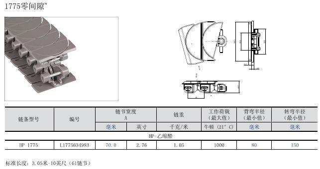 零间距1765龙骨铰链拥有设计的顶板。当该款链条在转弯轨道或链轮上运动时,链条表面始终保持封闭状态。