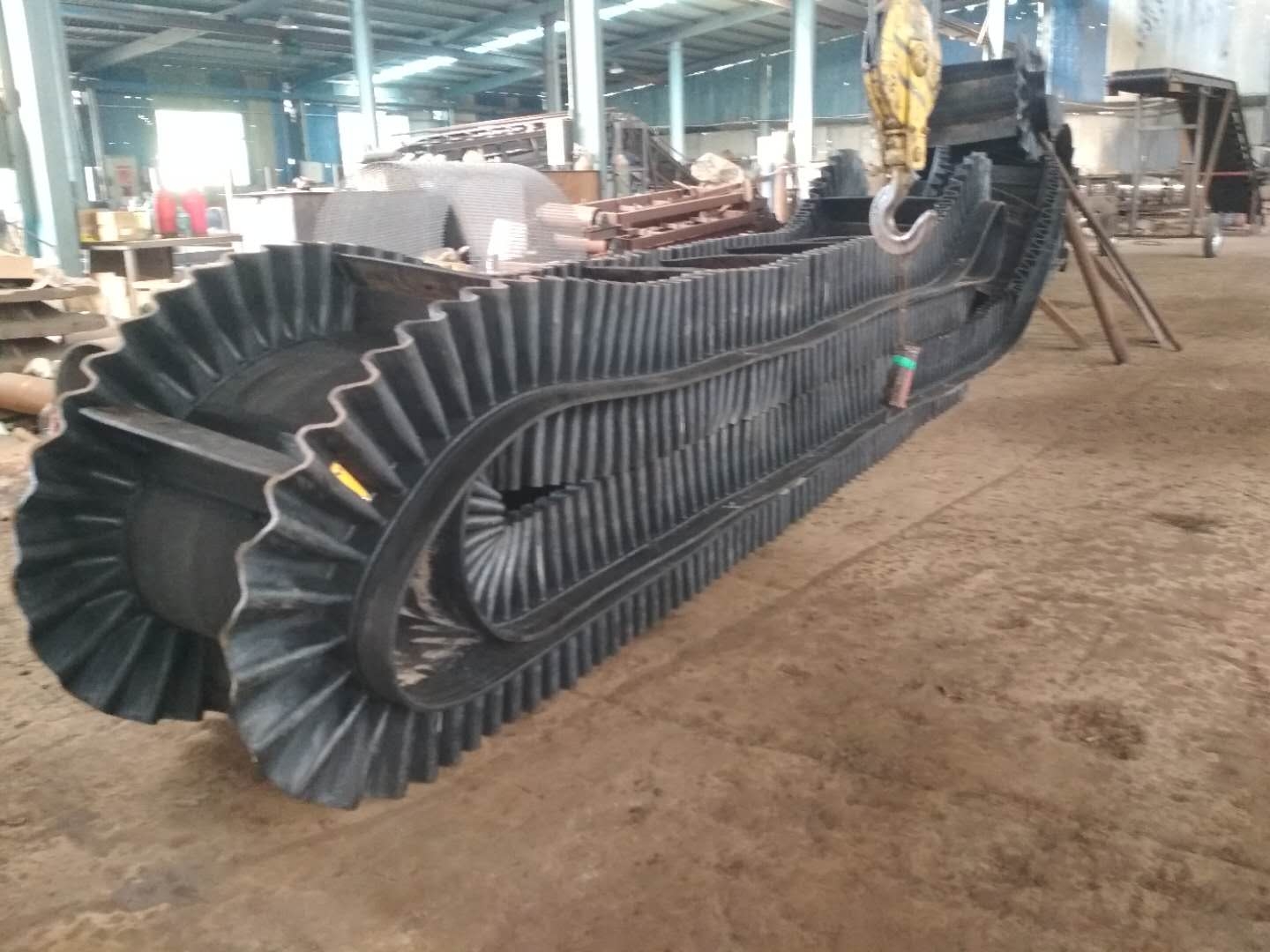 例如烟台鑫海矿山机械生产的大倾角波状挡边带式输送机使用波纹状输送带来取代普通输送带。与普通带式输送机。刮板输送机相比,解决了大规格输送带在回程过程塌带现象。防滑爬坡挡边输送机不锈钢防腐 建材专用