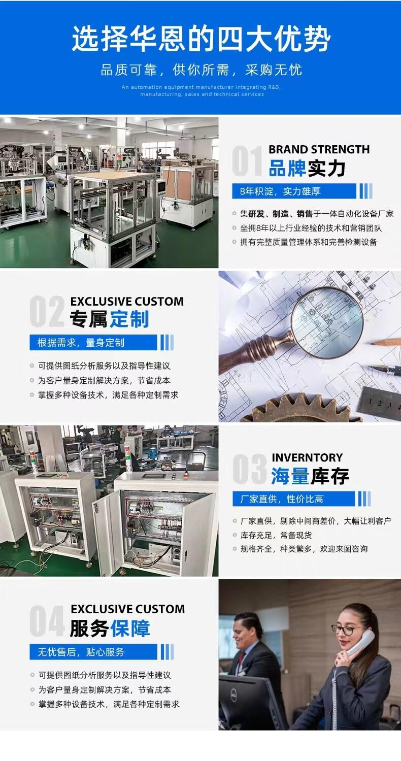 东莞市华恩精密科技有限公司于2013年在深圳成立,是一家集研发、生产、销售及技术服务于一体的自动化设备生产厂家,主营产品有直线模组、上下料机、滚筒升降输送机、全自动摆盘机、自动点胶机、自动螺丝机、自动焊锡机、还可定制各类非标自动化设备以及整线自动化方案和直线模组研发精密配件,货物或技术进出口。
